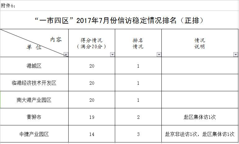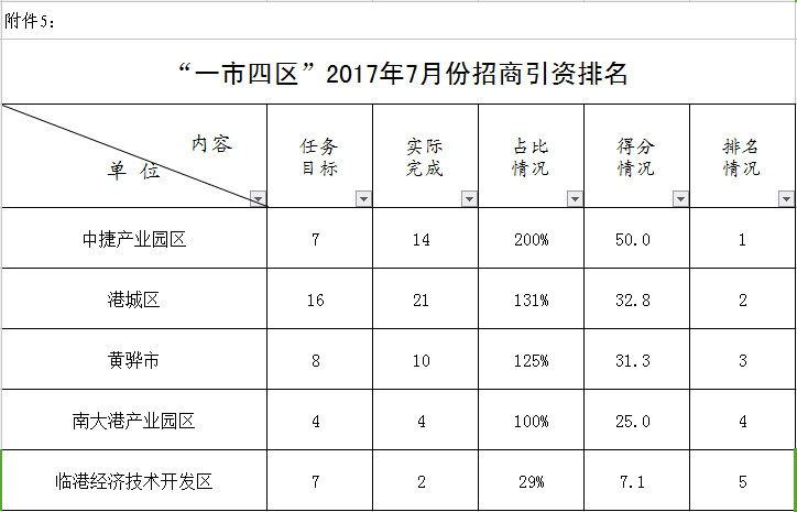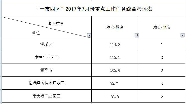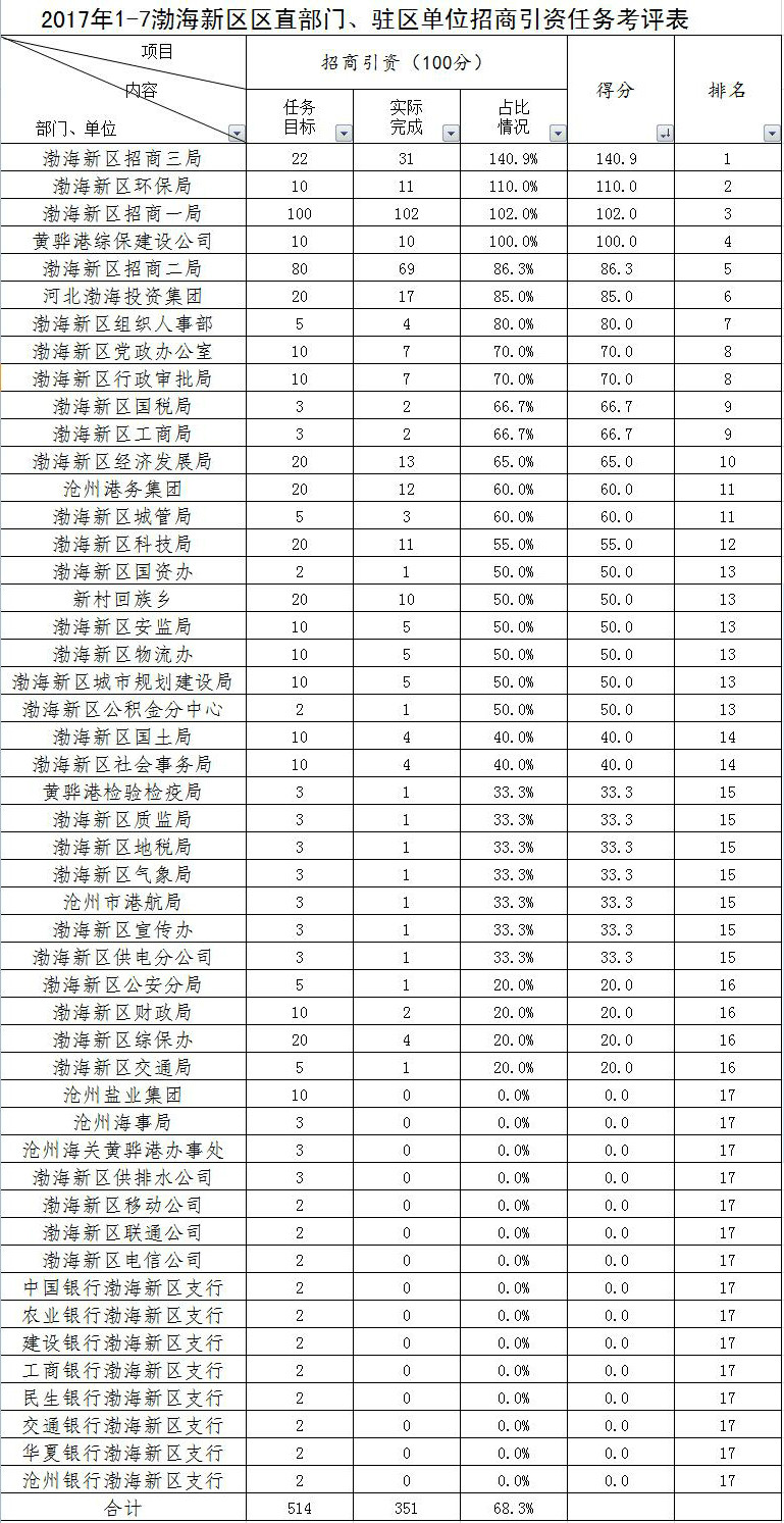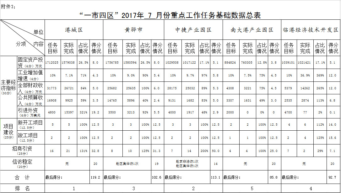 为牢固树立“想干事、会干事、快干事、干成事、不出事”的鲜明工作导向,积极营造“比学赶帮超”的浓厚氛围,打牢“沿海强区、壮美港城”建设坚实基础,沧州渤海新区党工委、管委会制定了《沧州渤海新区重点工作任务综合考评办法》,按每月、每季度考评“一市四区”及各部门工作成效并向社会通报。现将2017年7月份综合考评结果通报如下:
