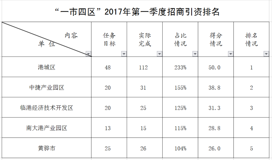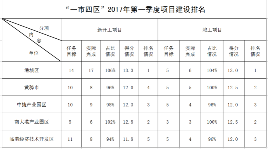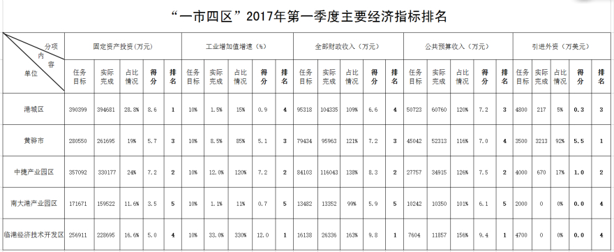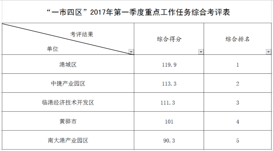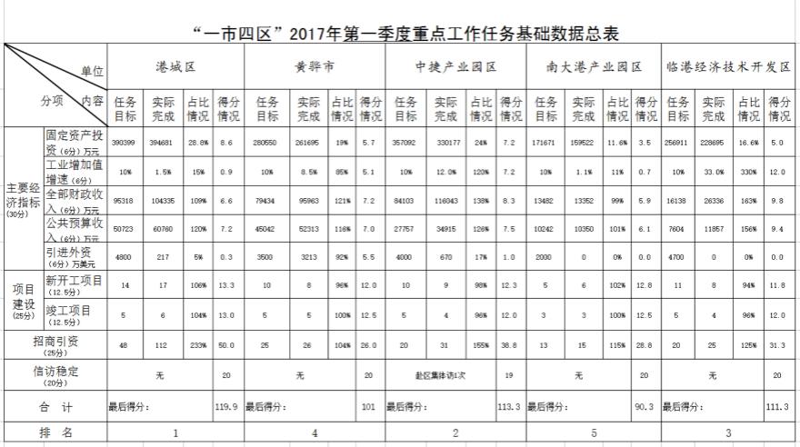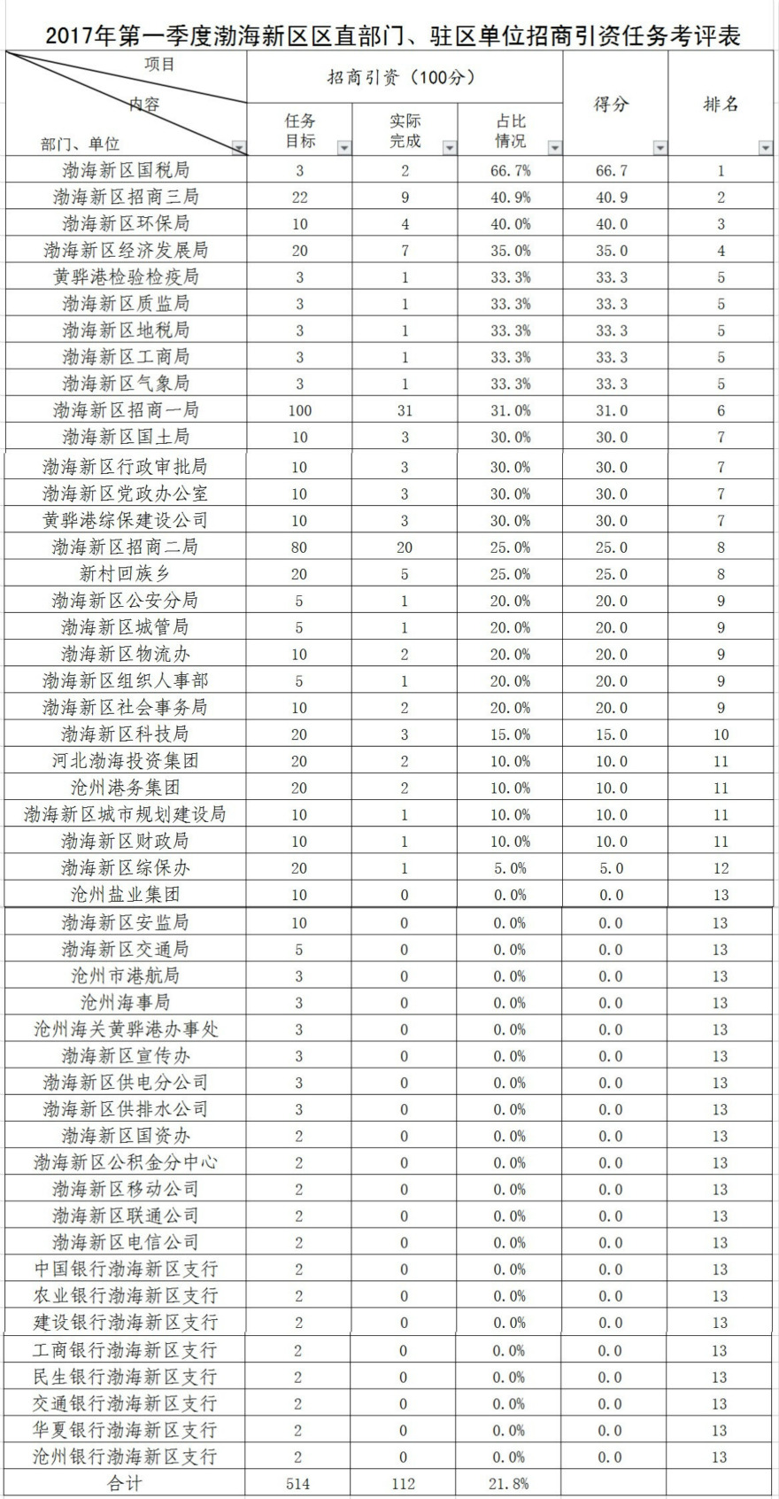 为牢固树立“想干事、会干事、快干事、干成事、不出事”的鲜明工作导向,积极营造“比学赶帮超”的浓厚氛围,打牢“沿海强区、壮美港城”建设坚实基础,沧州渤海新区党工委、管委会制定了《沧州渤海新区重点工作任务综合考评办法》,按每月、每季度考评“一市四区”及各部门工作成效并向社会通报。现将2017年第一季度考评结果通报如下: