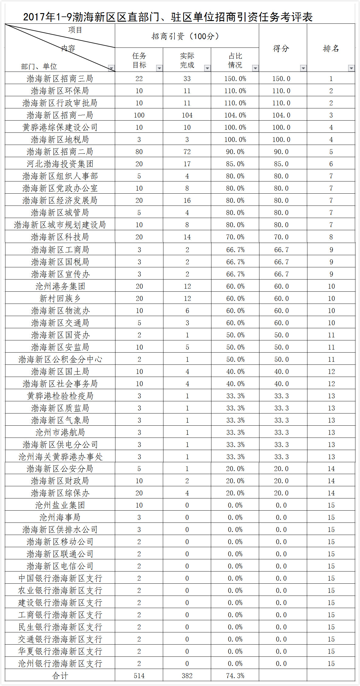 为牢固树立“想干事、会干事、快干事、干成事、不出事”的鲜明工作导向,积极营造“比学赶帮超”的浓厚氛围,打牢“沿海强区、壮美港城”建设坚实基础,沧州渤海新区党工委、管委会制定了《沧州渤海新区重点工作任务综合考评办法》,按每月、每季度考评“一市四区”及各部门工作成效并向社会通报。现将2017年9月份综合考评结果通报如下: