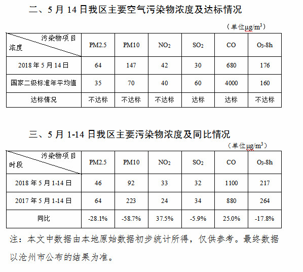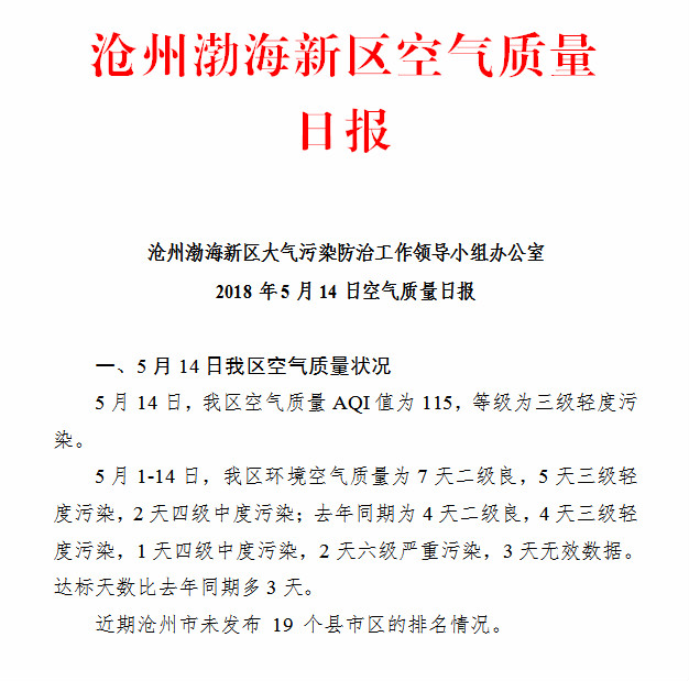 2018年5月14日渤海新区空气质量日报
